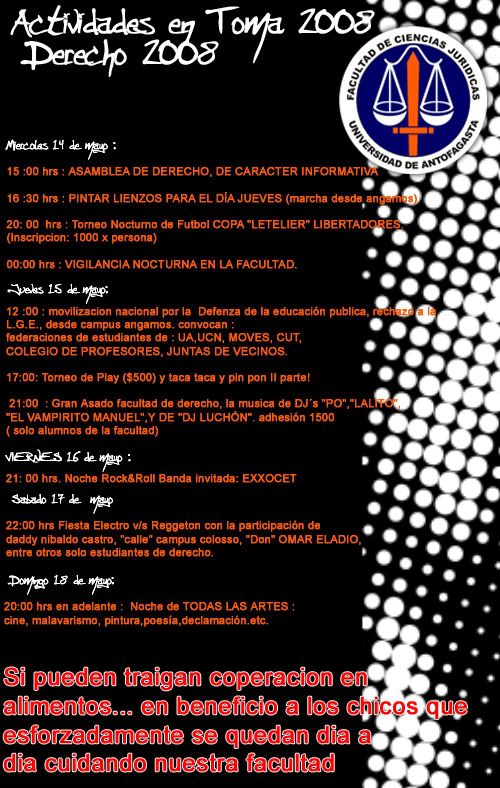 -todos los alumnos de derecho deben concurrir a la facultad y apoyar la toma, de manera que se organizaran turnos para cuidar la facultad, ya que es RESPONSABILIDAD DE NOSOTROS CUIDAR LA FACULTAD,porque mientras no esten los docentes y encargados la FACULTAD ES NUESTRA RESPONSABILIDAD. por eso mismo se realizaran diferentes actividades para motivarlos a concurrir.